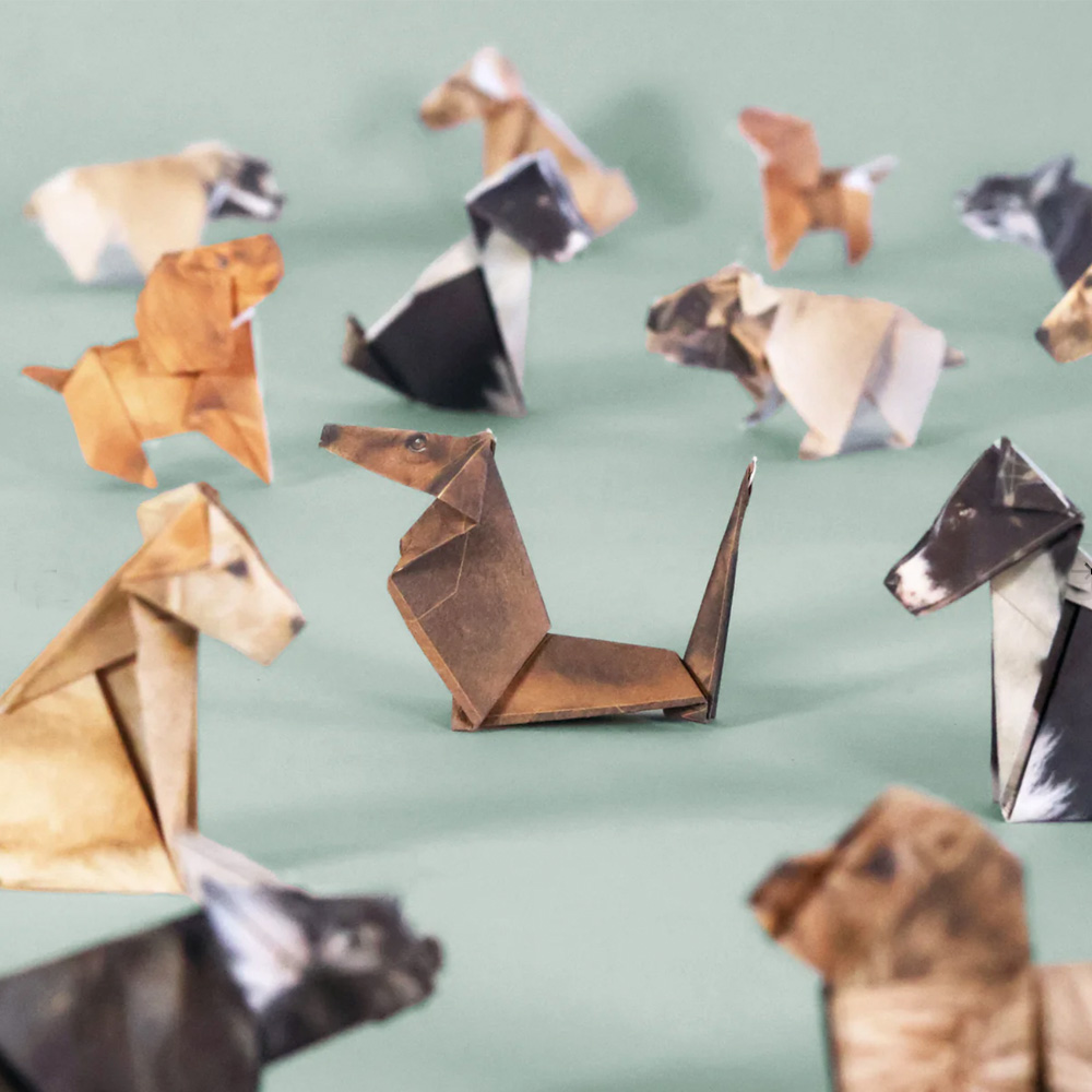 50 origami dog papers – each printed on FSC-certified, plastic-free paper using soy-based inks